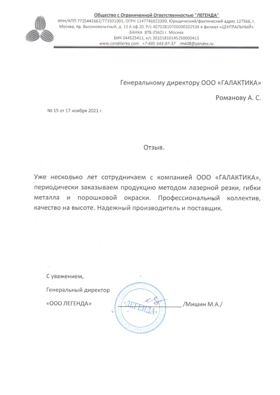 Приветствуем вас на странице компании «Галактика»! Мы более 14 лет работаем с металлом и знаем о нем практически все! Наши мощности позволяют: гнуть, резать, перфорировать и сваривать детали для заказчика. Полный цикл включает и порошковое окрашивание изделий. У нас налажено производство таких видов товаров как: - корзины, панели и экраны для кондиционеров; - фасадные кассеты; - объемные дизайнерские элементы; - отливы; - ограждения; - металлические бордюры. Новое высокоточное оборудование помогает производить тонкие работы быстрее и качественнее. Кстати, о качестве. Вся продукция проходит проверку на каждом этапе производства, так как мы очень дорожим репутацией и ценим постоянство. Можем предложить оформить доставку до объекта, чтобы избавить покупателя от проблем с логистикой. Также нам доверяют изготовление нестандартных изделий. Конструкторское проектное бюро "Галактика" поможет с уже готовым эскизом, либо выполнит чертеж по техническому заданию. Оформит необходимую документацию по всем требованиям законодательства. Если вам нужен надёжный подрядчик при строительстве объекта, или для выполнения сложного дизайнерского замысла потолков, стен, оформления ограждений, разграничения уличного пространства, то теперь вы знаете, где его искать. Мы рады быть частью интересных и амбициозных проектов!